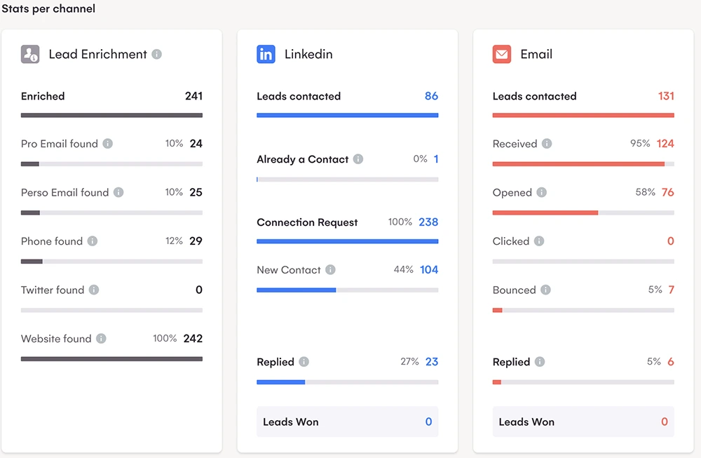 - Multichannel Campaigns: Run outreach on LinkedIn, email, and Twitter, adjusting messages based on prospect behavior.