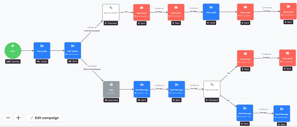 - Kanbox: Kanbox's automation capabilities make LinkedIn prospecting almost effortless. With the ability to automate actions like profile visits, follows, post likes, connection requests, and personalized messaging (complete with follow-ups), Kanbox lets you maintain consistent engagement while keeping that personal touch. Plus, the Kanban pipelines automatically shift prospects through different stages of your campaign, letting you visualize and manage everything with ease. It's the ideal setup for sales teams looking for efficiency and clarity in their outreach.